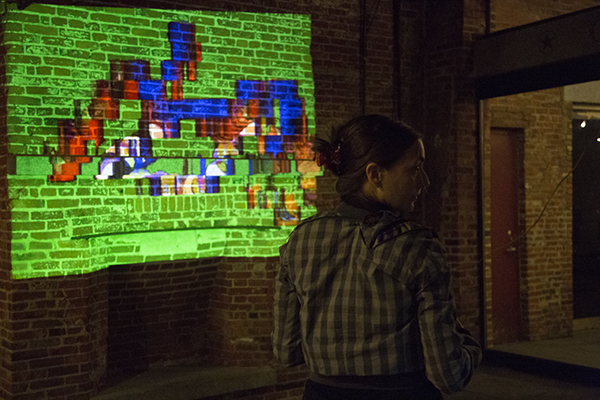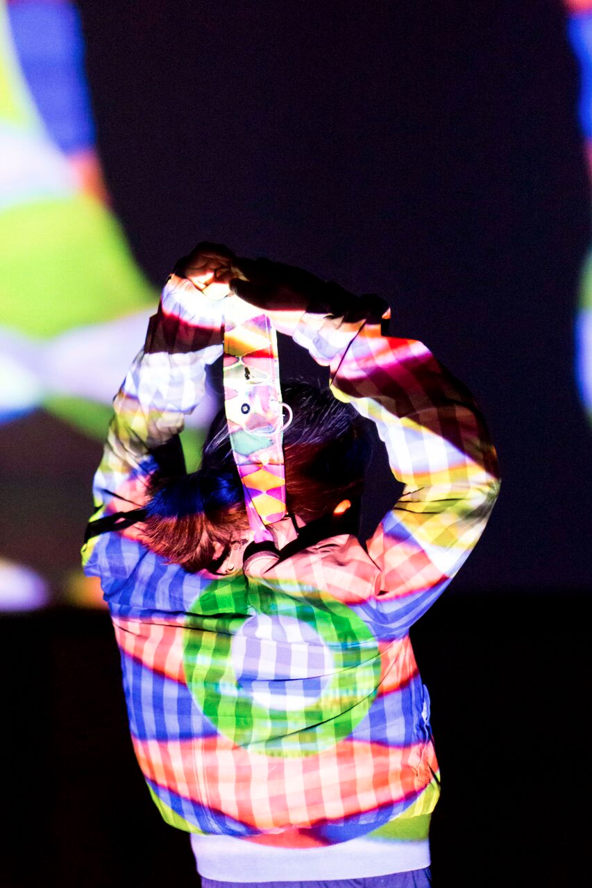 Reaction Wear is an audiovisual performance with wearable technology and movement. LoVid together with collaborators Ashley Byler (dance), Sally Im (costume), Tyler Henry (technology) designed an interface that integrates the body of the performer with technology and the architecture of a performance space.